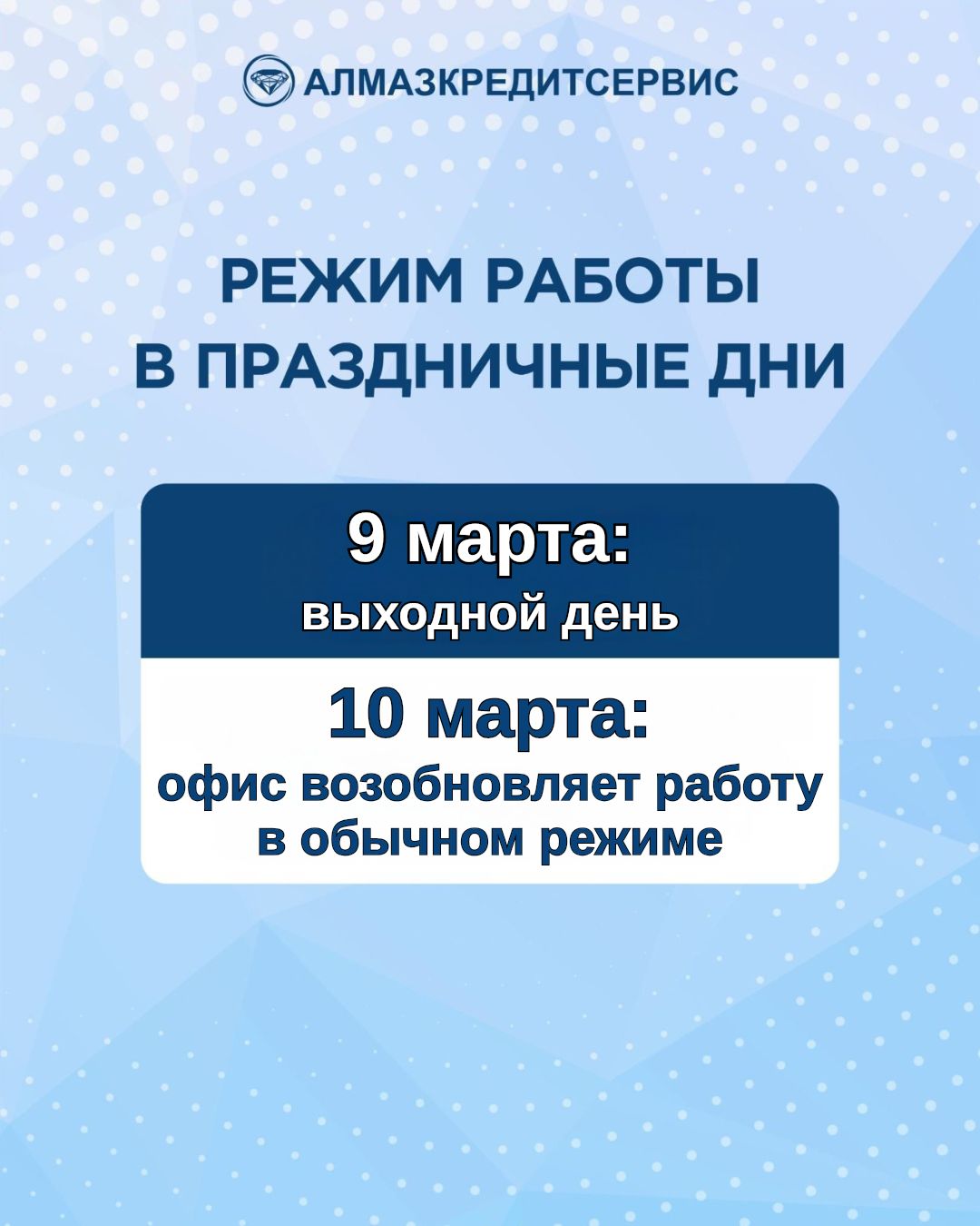 10 марта — офис «Алмазкредитсервис» возобновляет работу в обычном режиме