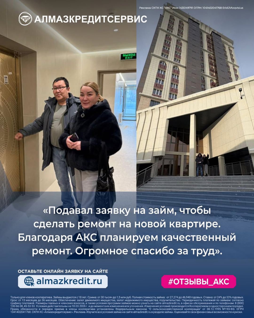 «Хочу поблагодарить сотрудников офиса КУ Сунтар за грамотное обслуживание. Подавал заявку на займ, чтобы сделать ремонт на новой квартире. Одобрили быстро, условия самые выгодные, хорошие даже чем в других банках. Главное процент низкий. Всё подробно объяснили. Благодаря вам планируем качественный ремонт нашей новой квартиры.