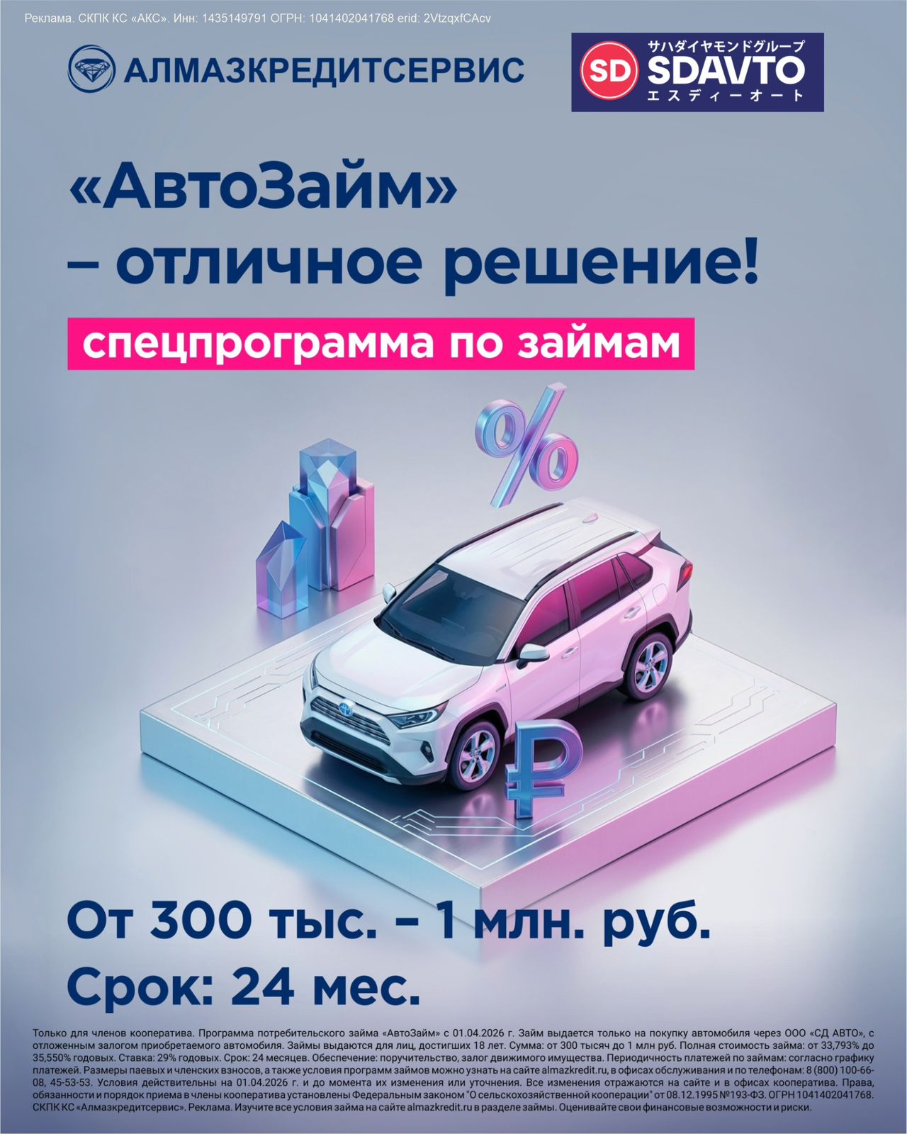 Реклама. СКПК КС «АКС». Инн: 1435149791 ОГРН: 1041402041768 Все условия, контакты и адреса на сайте: almazkredit.ru Только для членов кооператива СКПК КС «АКС». Членом кооператива может стать любой житель РС(Я) старше 16 лет. Займы выдаются с 18 лет. Изучите все условия займа на сайте almazkredit.ru в разделе займы. Оценивайте свои финансовые возможности и риски.