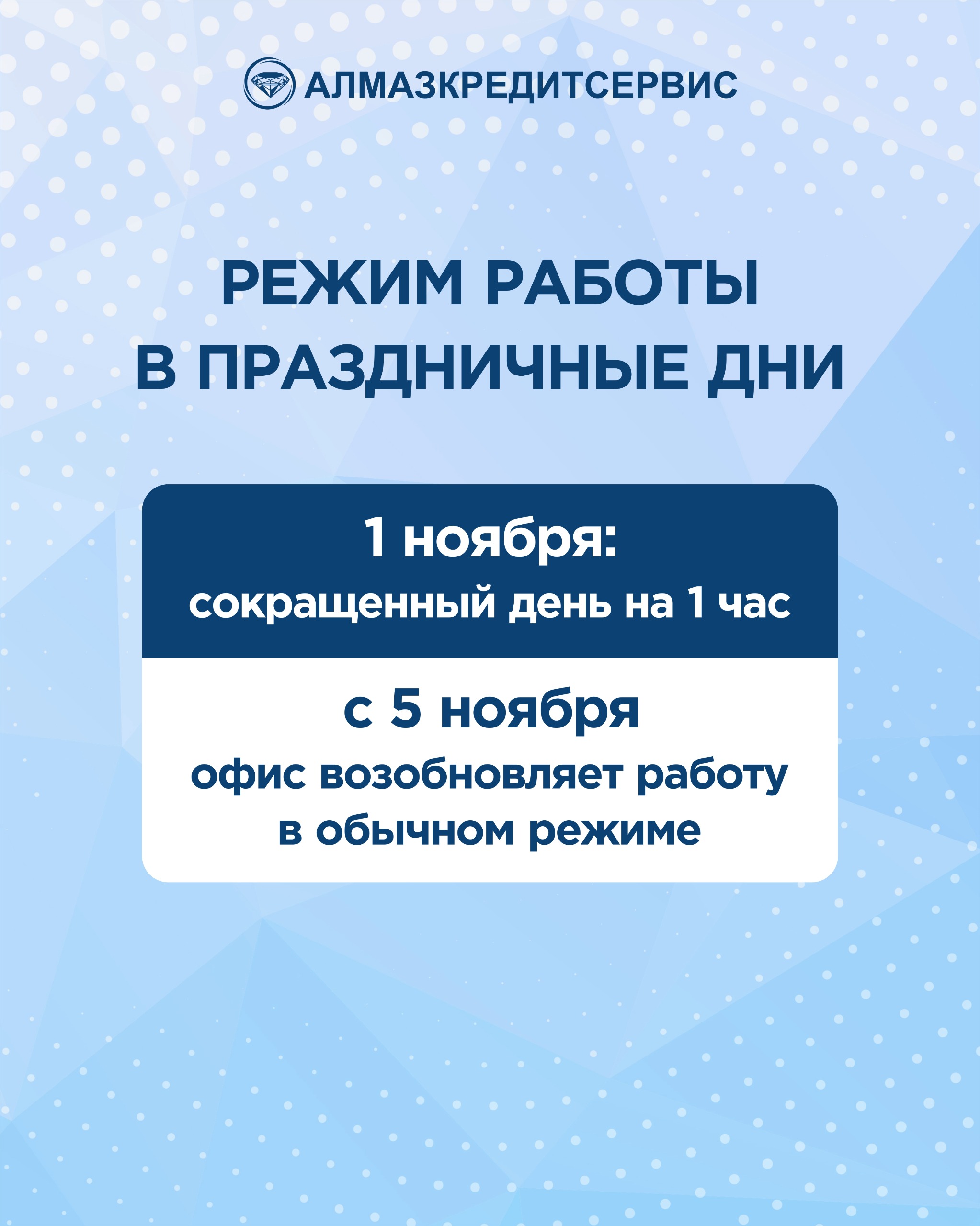 С 5 ноября — офис «Алмазкредитсервис» возобновляет работу в обычном режиме
